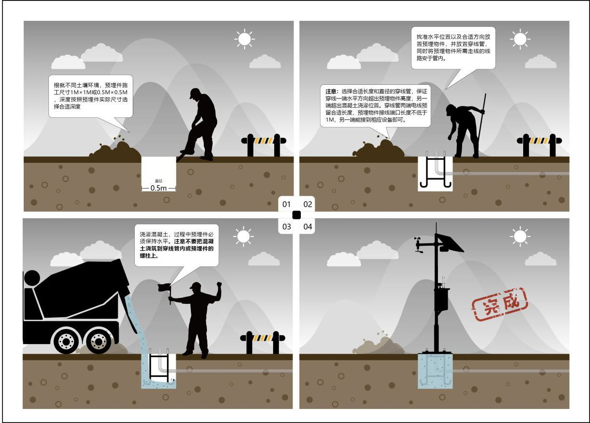 3、布線,根據(jù)訂單需求提前合理布線,包括電源線。如需要布線,澆筑混凝土前,需要先放置穿線管,常規(guī)為PVC材質(zhì)的塑料管,直徑根據(jù)供電線纜尺寸自定。穿線管需高于預(yù)埋件中心預(yù)留孔5cm,另一端以能接到相應(yīng)設(shè)備處為標準。
